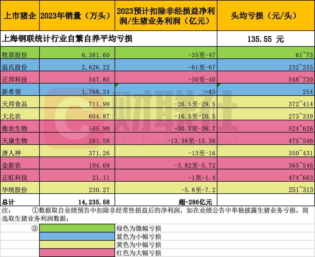 上市猪企则成了量增价减的主力贡献者,据财联社记者不完全统计,在超15家上市猪企公布2023年业绩预告,累计出栏量达到1.4亿头,但整体亏损已超286亿元,同时多数上市猪企头均亏损额高于市场平均水平。