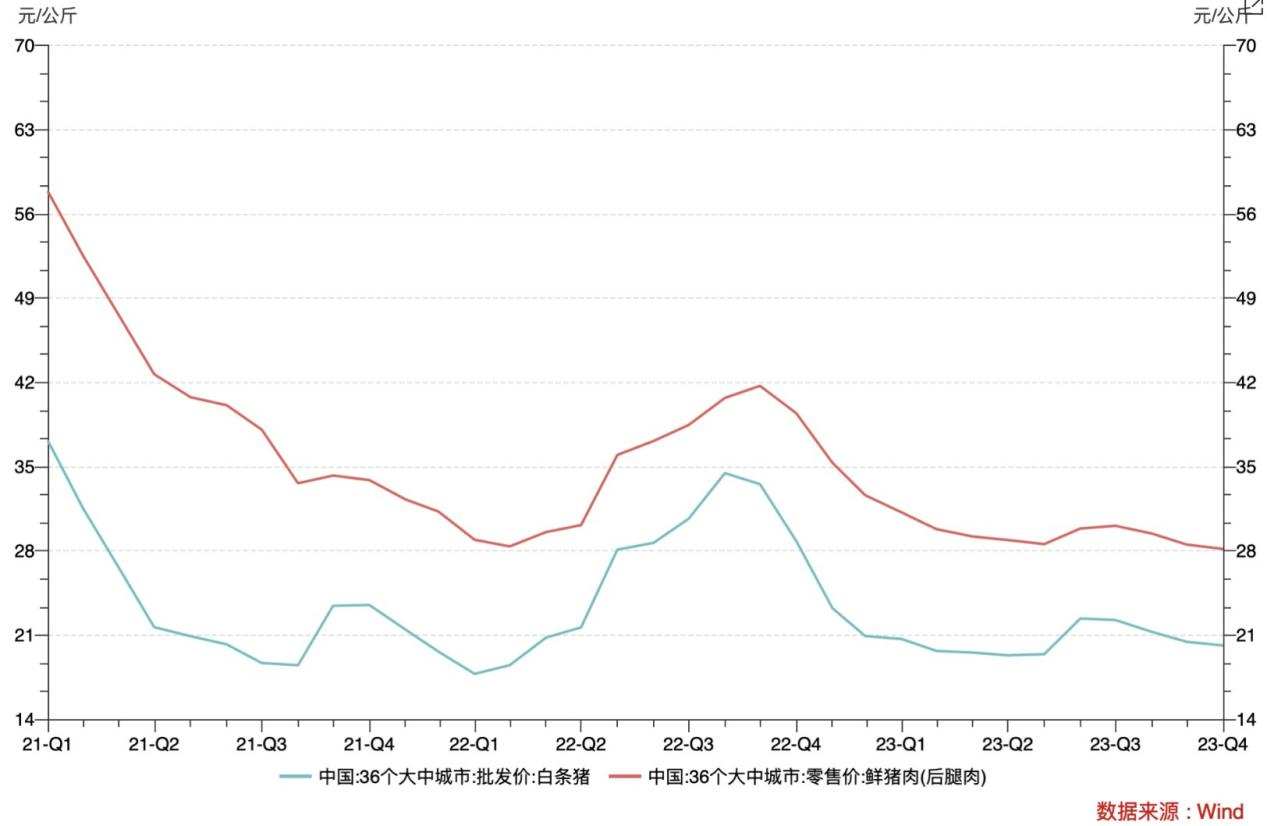 数据显示,从去年年初开始,全国白条猪批发价与鲜猪肉批发价持续回落,其中猪鲜肉批发价甚至跌至21年以来的最低水平。