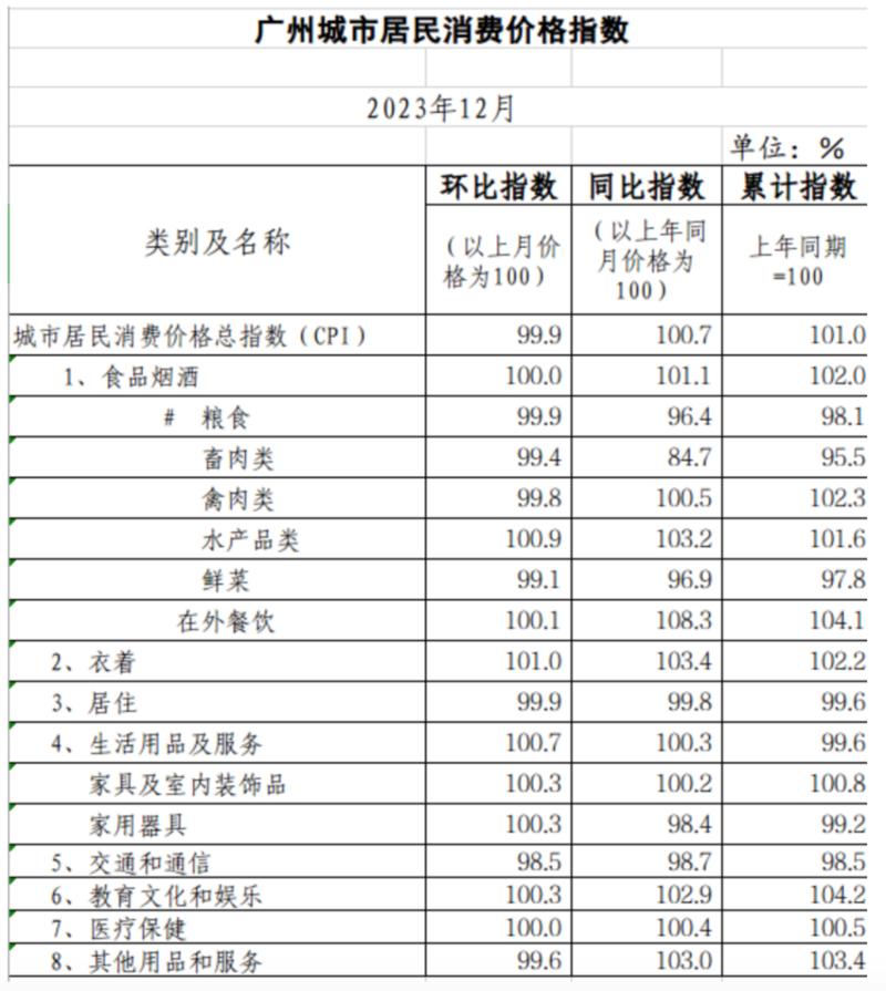 1月14日,国家统计局广州调查队发布的最新数据显示,去年12月,受国际油价下行、旅游出行淡季、猪肉供应总体充足等因素影响,广州居民消费价格指数(CPI)环比下降0.1%。受燃油车市场份额和利润逐步下降、国际原油期货市场价格下行等因素影响,广州工业生产者出厂价格指数(PPI)同比下降3.1%,降幅比上月收窄0.3个百分点。